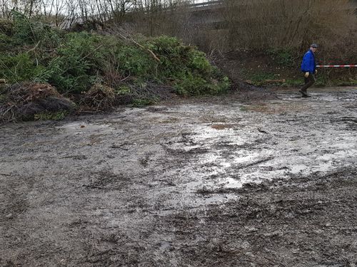Grund dafür ist offensichtlich das warme Wetter, das den nicht geteerten Teil des Grüngutplatzes aufweicht und in eine sumpfige Schlamm-Landschaft verwandelt.